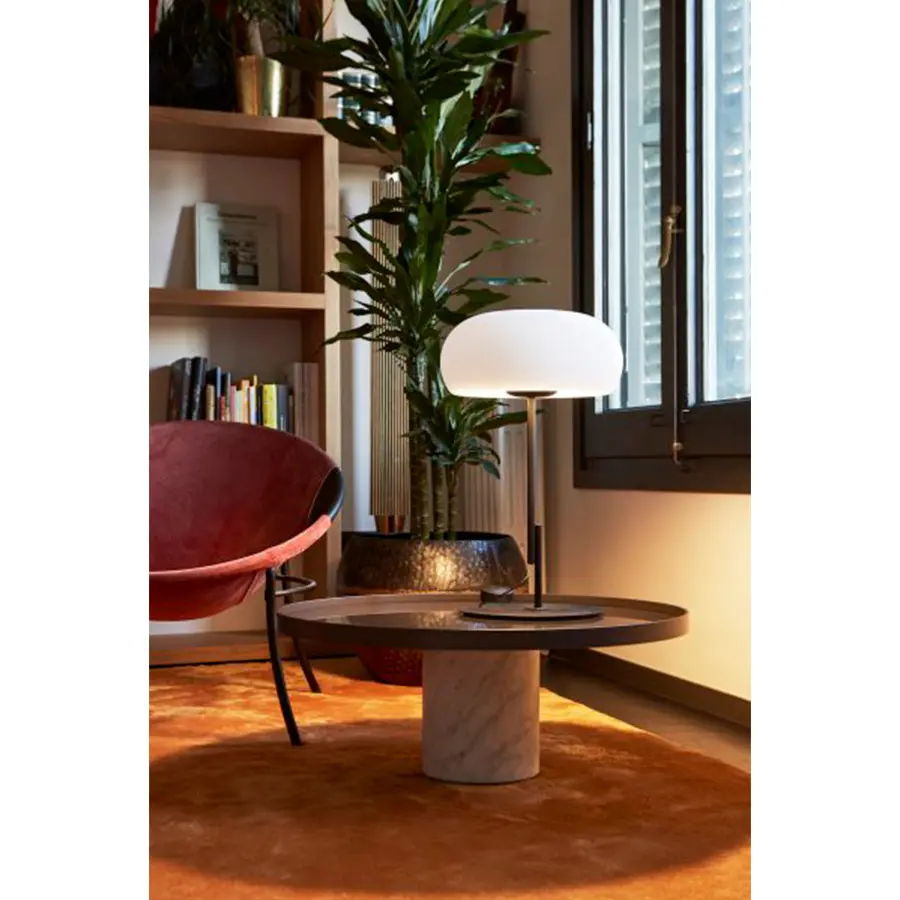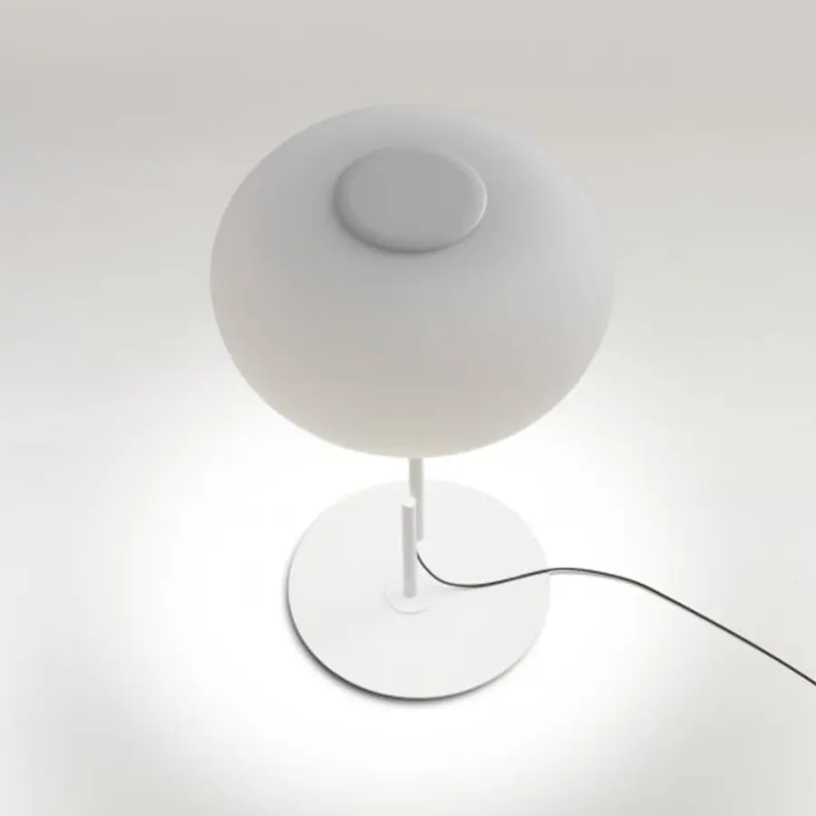 Pantalla de cristal soplado mate con disipador de aluminio lacado. Base y tija en hierro lacado. Dimmer con sensor de 3 posiciones.