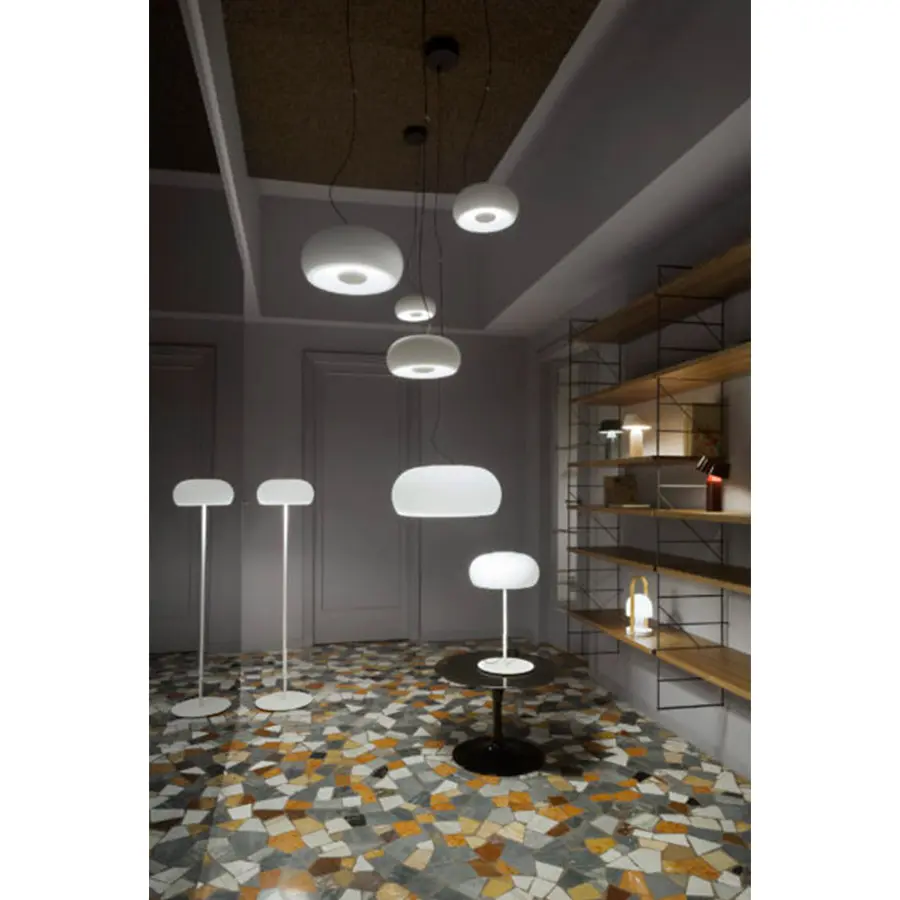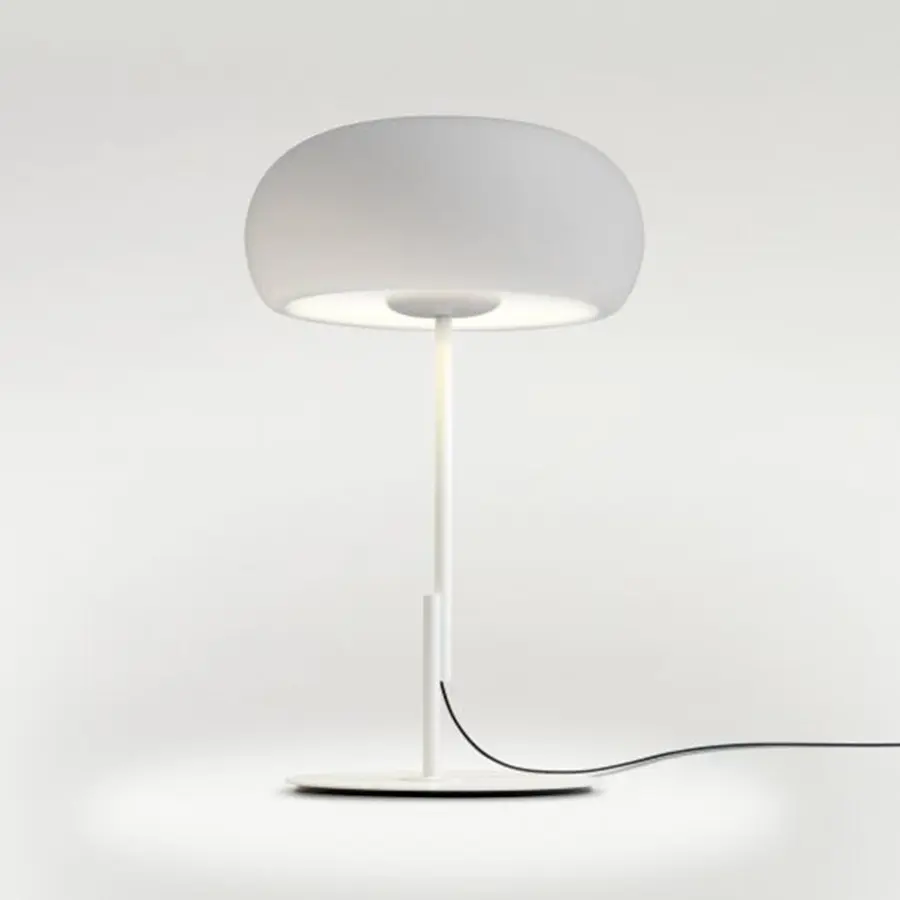 Esta colección ha sido diseñada para mesa, suspensión y pie en distintos diámetros -20, 32 y 43 cm-. En las versiones de mesa y pie la tija se divide en dos partes desiguales, un detalle que rompe su equilibrio aportando belleza y que resuelve de forma elegante la salida del cable.