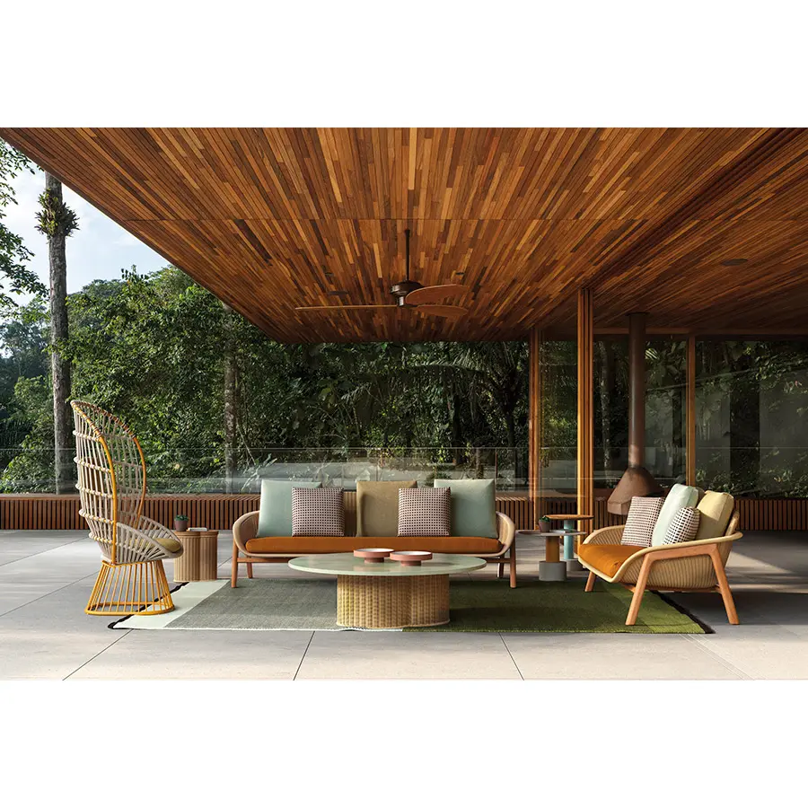 Sofá 2 plazas con pies en Madera Teca, de la colección Vimini por Patricia Urquiola, creado con una estructura de madera, mas tosca y con una carcasa de fibra sintética. Esta colección te hará sentir en casa gracias a sus acabados y diseño.
