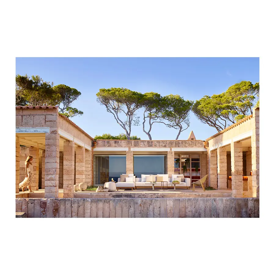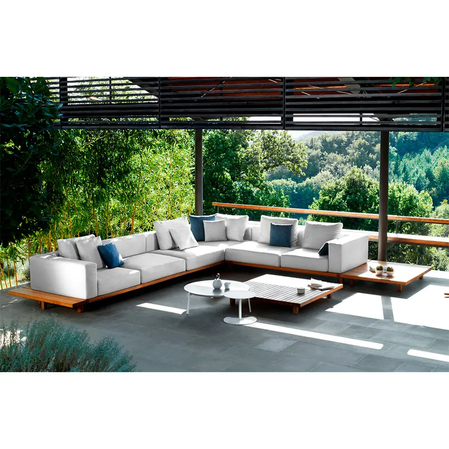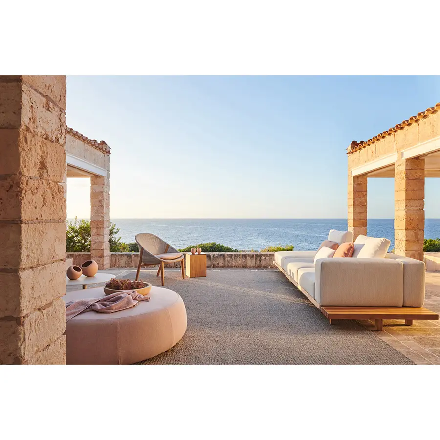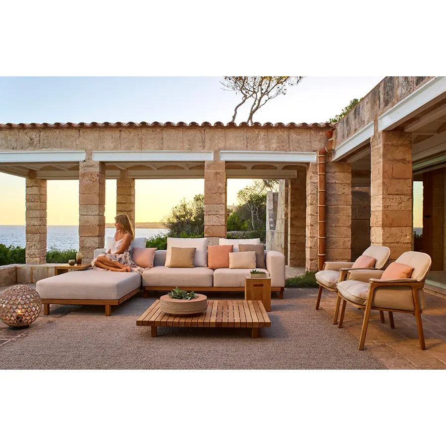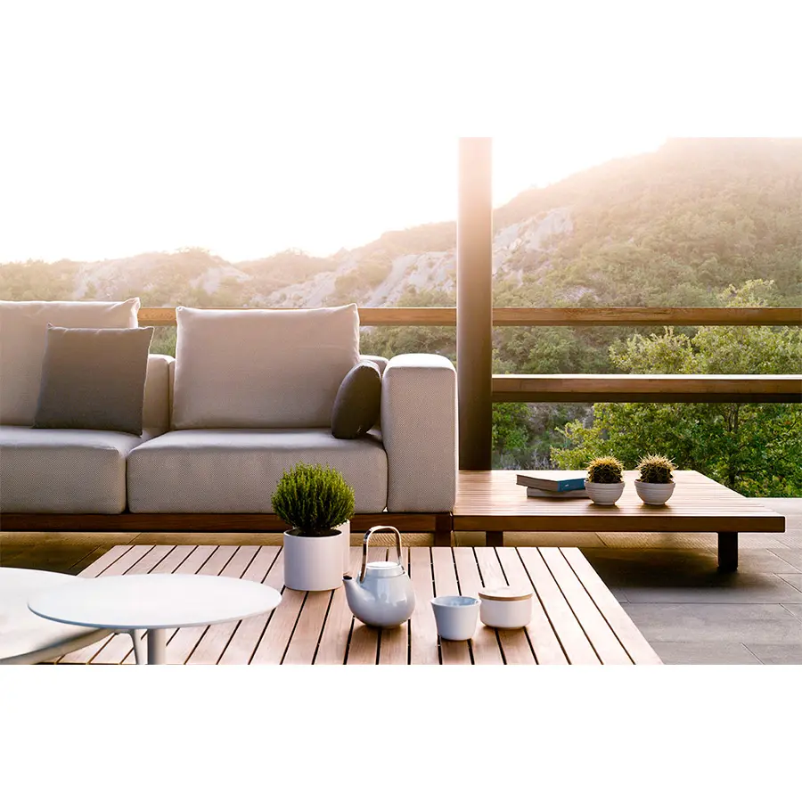 De esta forma el sofá ofrece una bella apariencia desde todas las perspectivas. Las plataformas auxiliares del sofá son iguales que las mesas laterales de las tumbonas, de forma que los diferentes elementos de la colección se pueden adaptar entre sí.