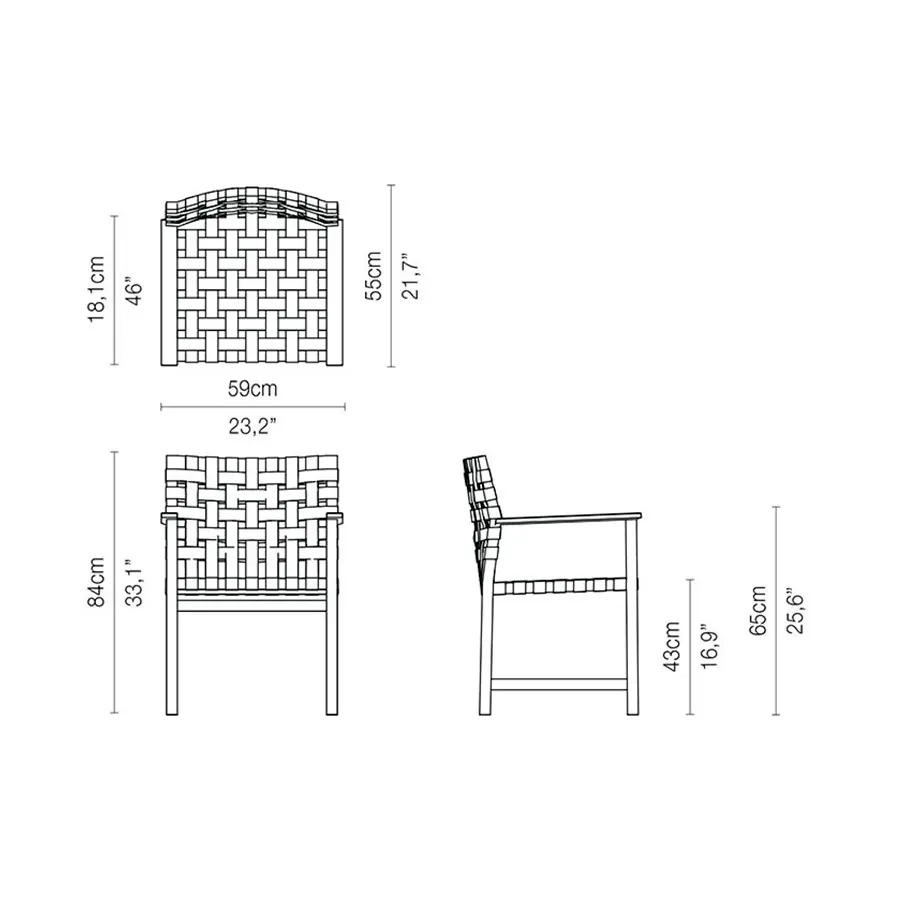 Las sillas están revestidas con un vaporoso tejido de Canax® resistente a la intemperie, compuesto por PVC y cáñamo natural.