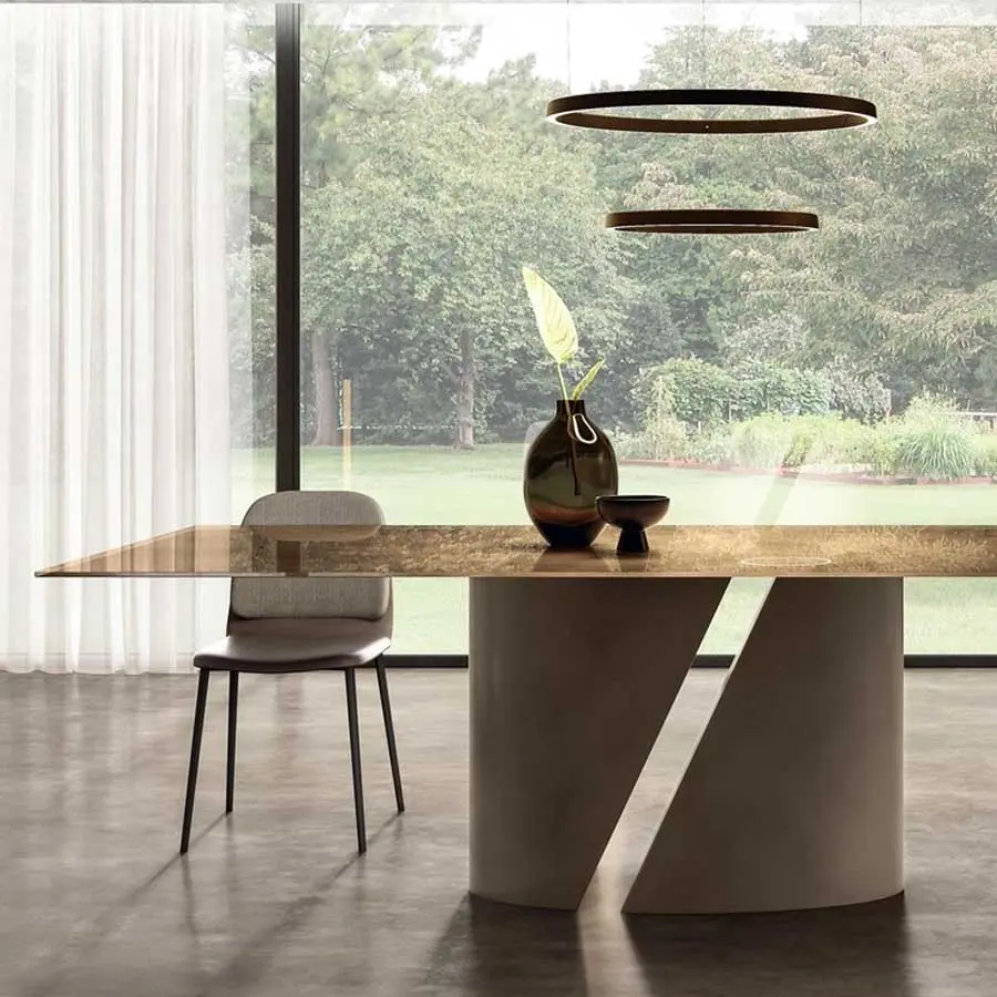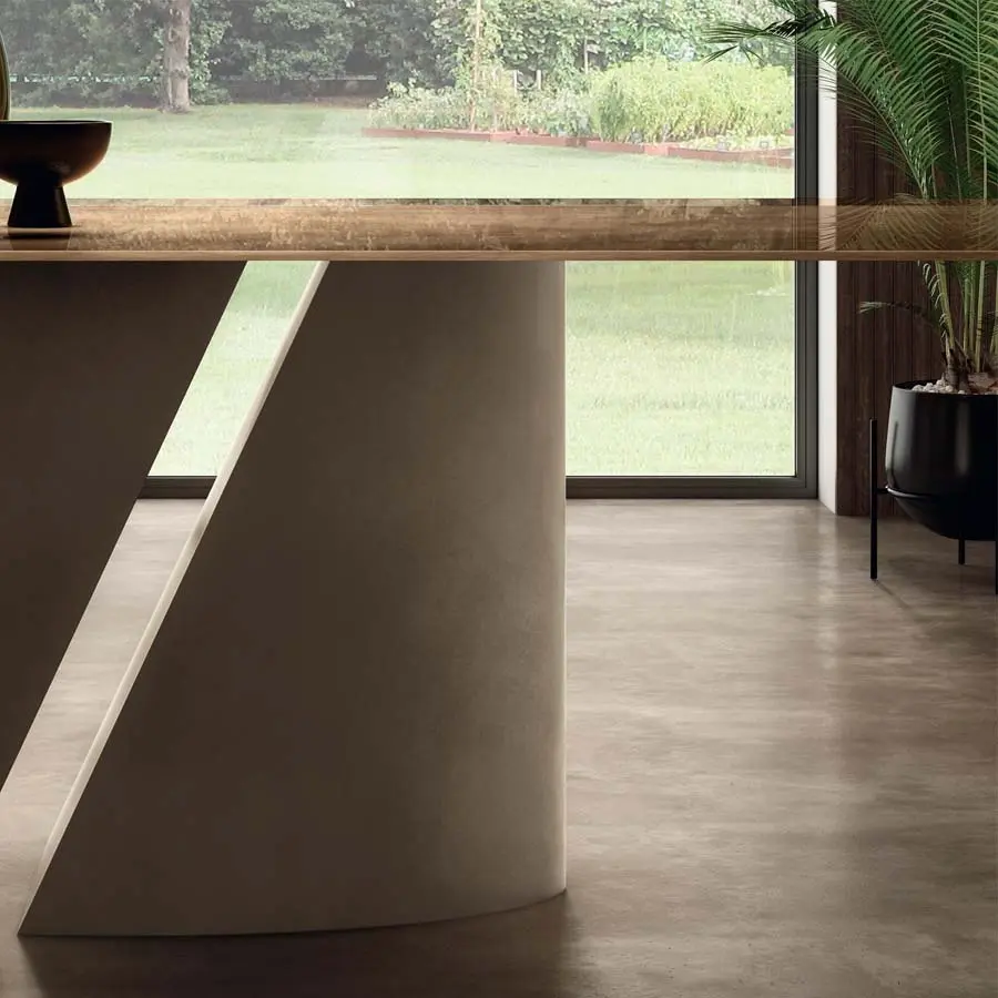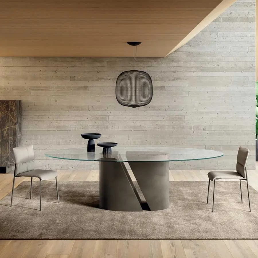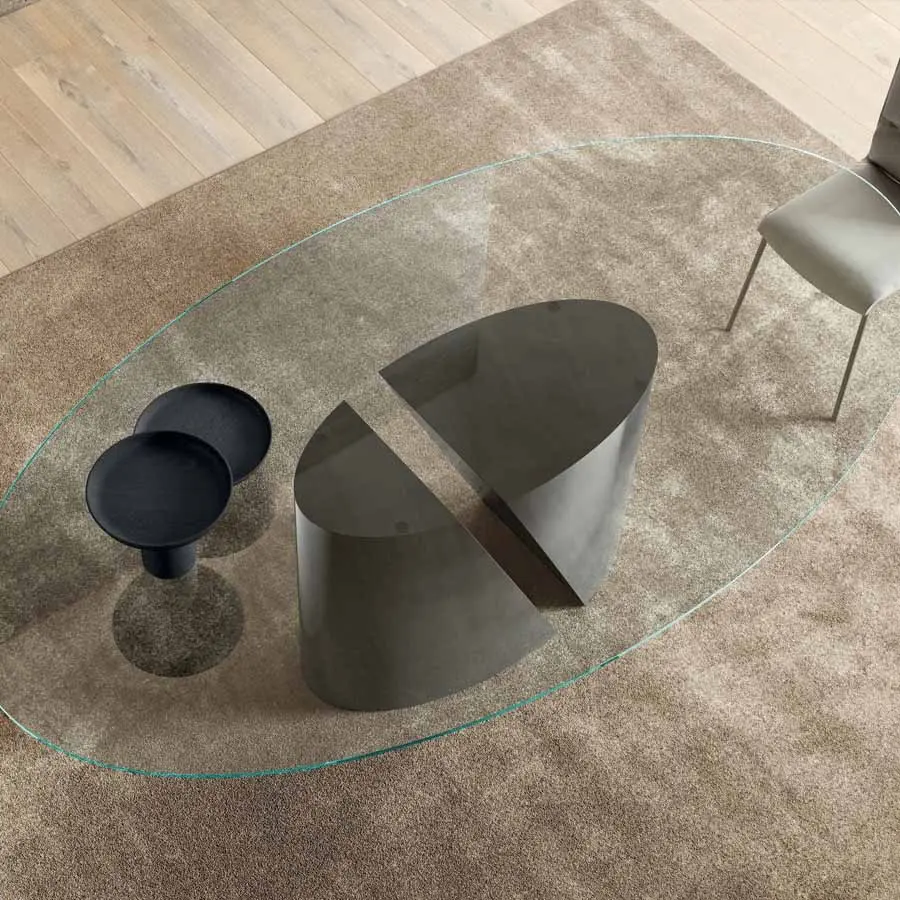 Un corte limpio divide la base elíptica de la mesa elegante Wadi en dos secciones y revela un dinamismo inesperado. Los elementos de la base en metal se contraponen a la ligereza del fino tablero, disponible en tres formas y en diversos materiales: desde la madera Wildwood al cristal y a los valiosos acabados en mármol, metal, madera y tejido XGlass. De esta forma la mesa Wadi comunica un fascinante rigor formal y un moderno impacto arquitectónico.