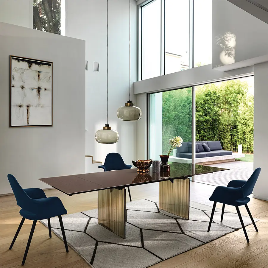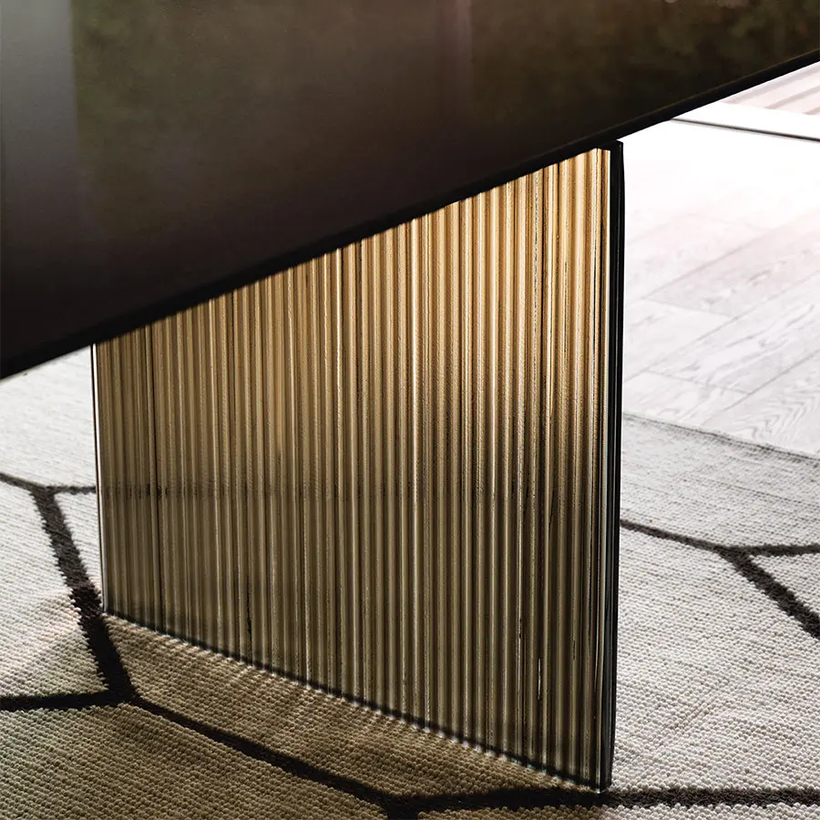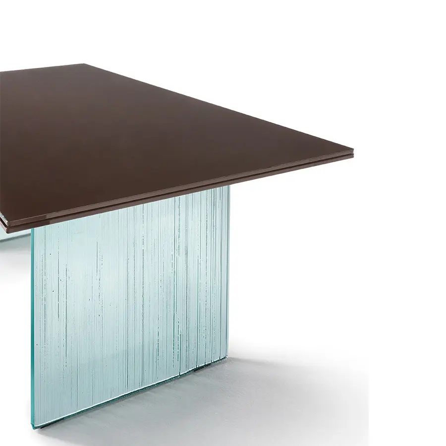 Mesa fija o extensible con base hecha a base de dos elementos de vidrio DV de 30 mm, transparentes o con franjas de colores. Encimera disponible en vidrio transparente de 12 o 15 mm, lacado en la parte posterior con tonos monocromáticos, o a mano con Ecomalta, con una textura de grano más fino.