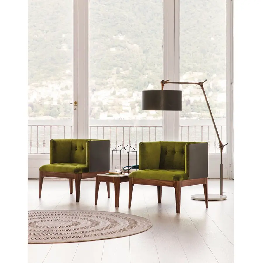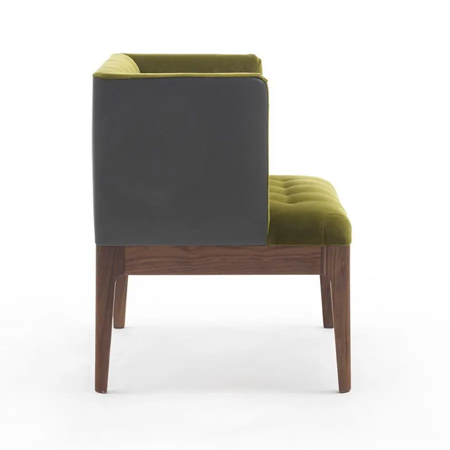Butaquita con estructura en nogal canaletta macizo y asiento con decoración capitoné en las telas de la colección. Posibilidad de combinar telas diferentes entre asiento y respaldo y de pedir los botones tono sobre tono o en contraste.