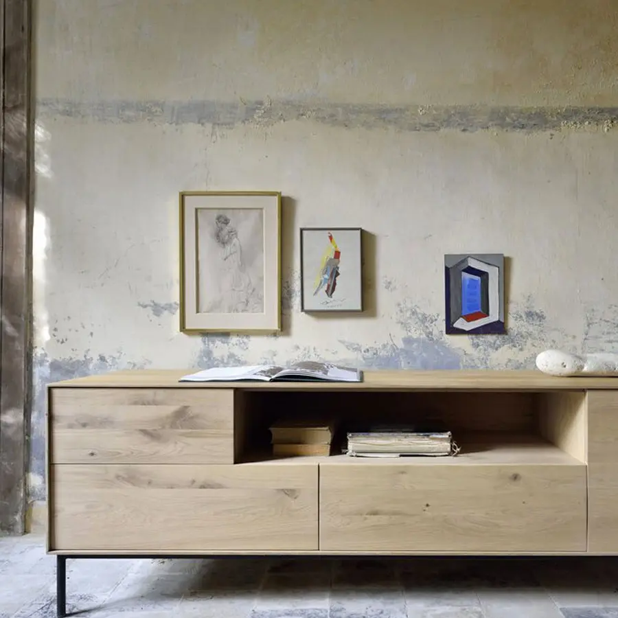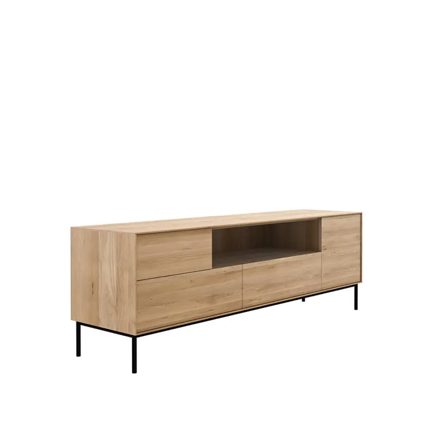 El mueble de TV Whitebird cuenta con 1 puerta abierta, 1 puerta abatible y 2 cajones. Fabricado en roble macizo con acabado con un barniz mate y patas de metal negro.