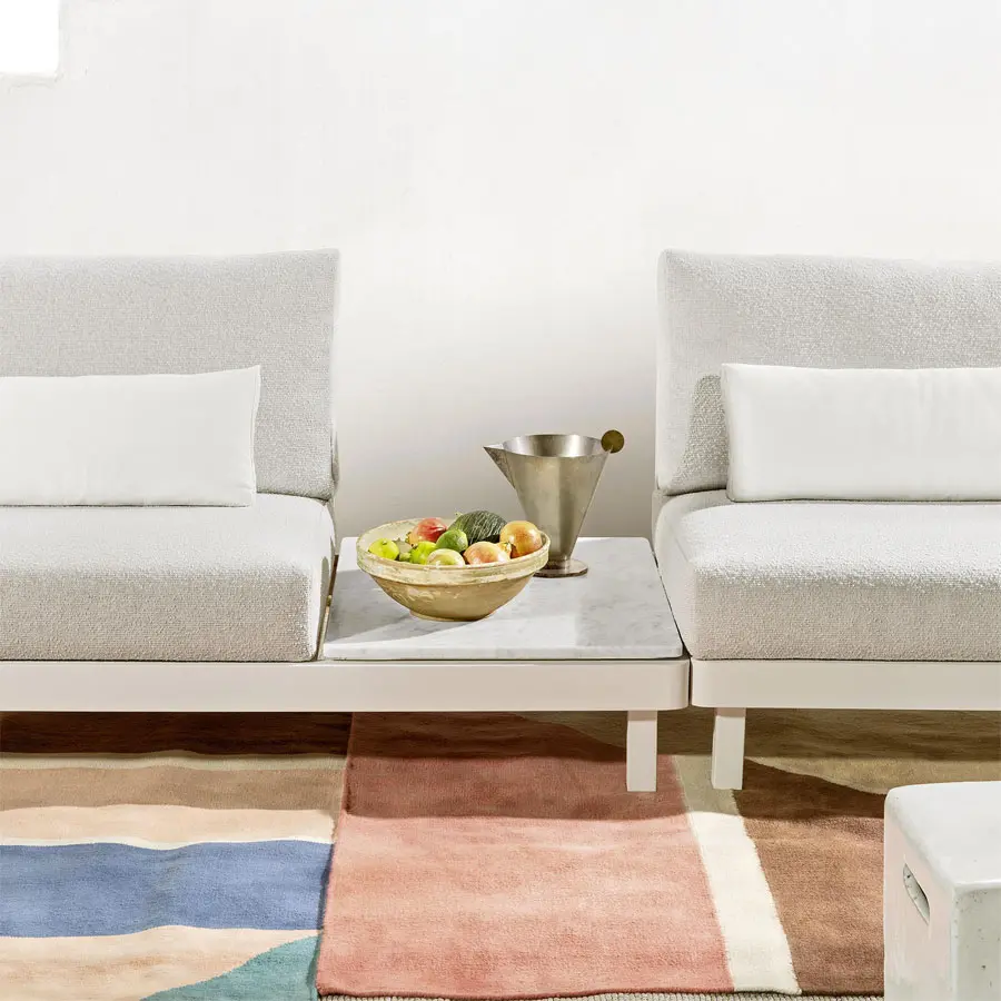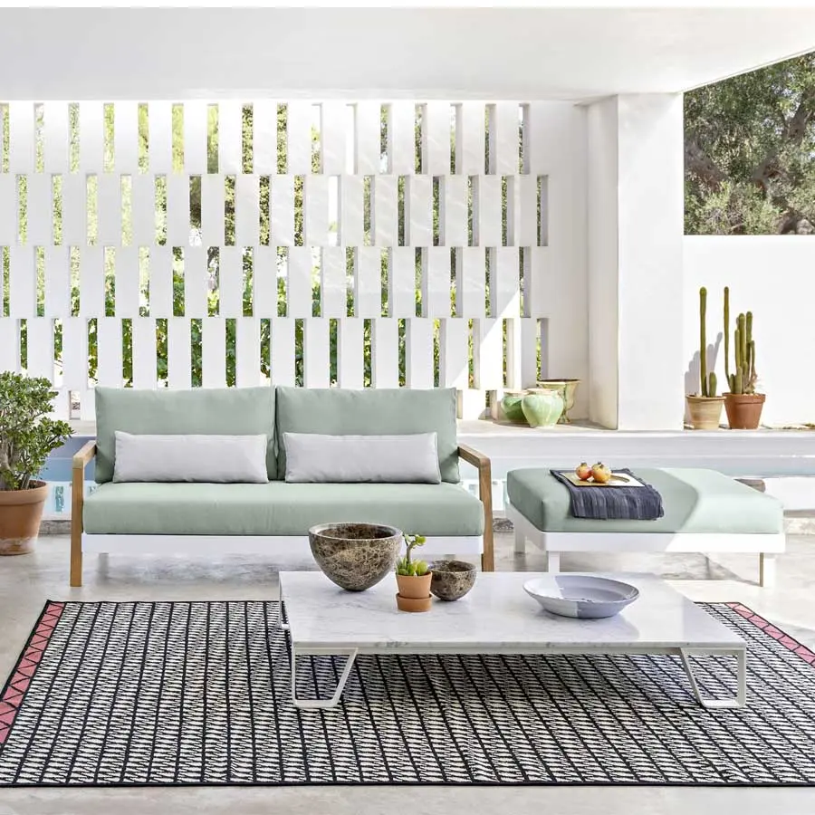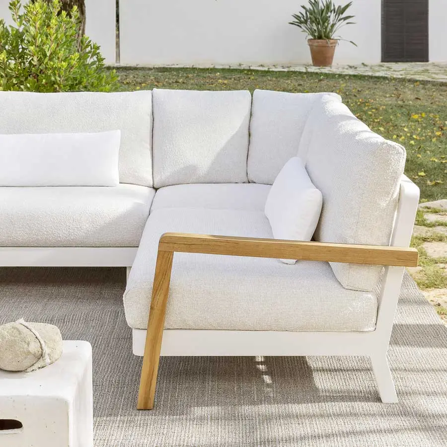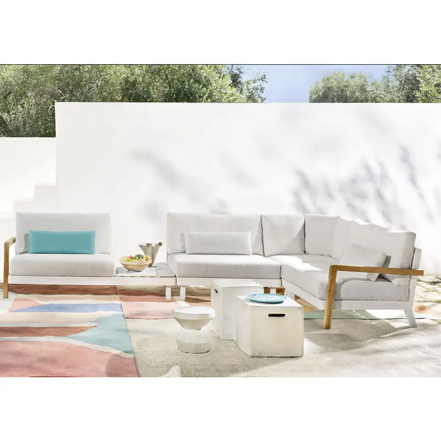La familia de sofás WIN combina la ligereza del aluminio de la estructura, disponible en los acabados blanco y gris, con la ductilidad y resistencia de la teca natural, utilizada para los brazos. Los asientos bajos son confortables, gracias a profundos cojines desenfundables, utilizados también para el respaldo, junto a cojines de apoyo, para un marcado confort.