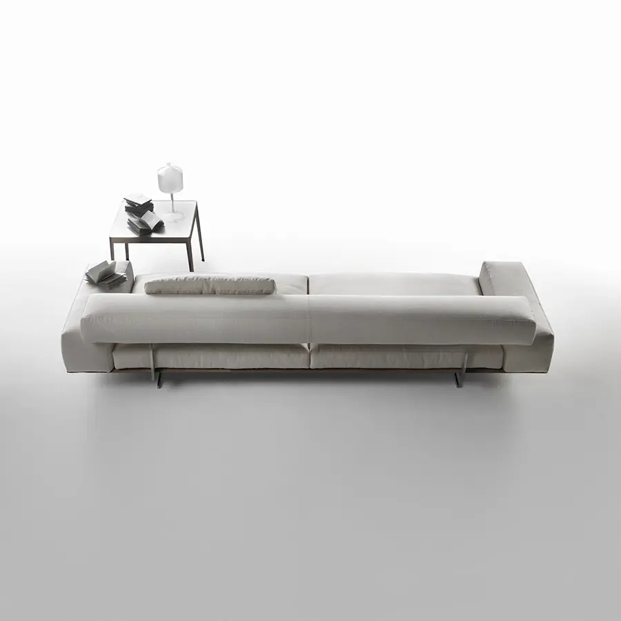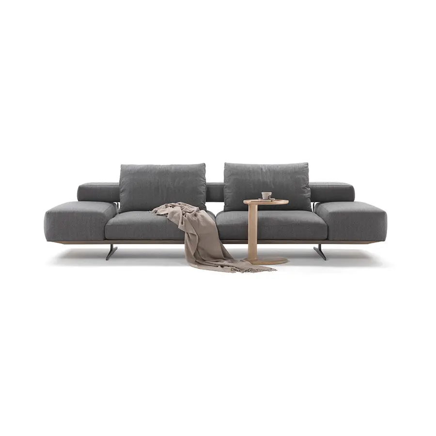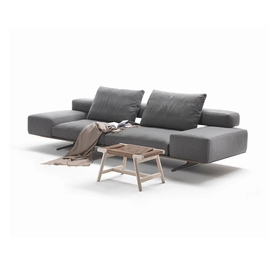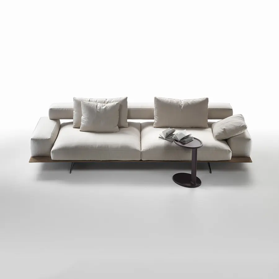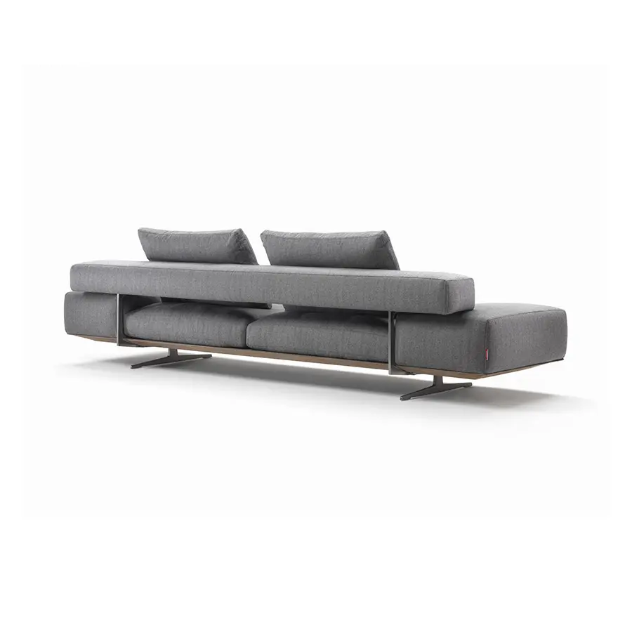 Aéreo y ligero, el sofá Wing presenta una construcción arquitectónica compuesta de volúmenes geométricos a la par que suaves y completamente desprovistos de aristas. La refinada base de metal fundido a presión colocada en una posición retrasada, casi invisible a la vista, hace que el sofá parezca flotar en el aire. Los suaves cojines del asiento rellenos de pluma de ganso con un inserto de material no deformable se apoyan en la estructura recubierta de cuero, mientras que el respaldo está constituido por un suave paralelepípedo, bajo y profundo, enganchado a la estructura por medio de unos elementos de conexión de aluminio fundido a presión. El reposabrazos, que también es bajo y profundo, descansa directamente sobre la estructura de cuero. Lineal y modular, el sofá Wing es adecuado tanto para inclusión en espacios domésticos como en proyectos de hostelería.