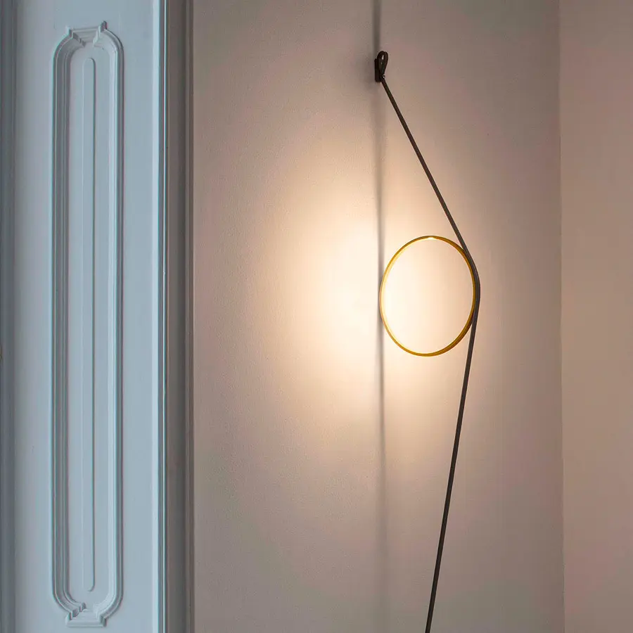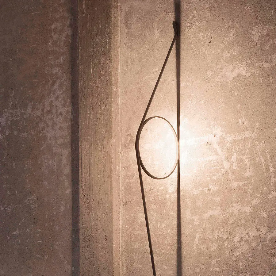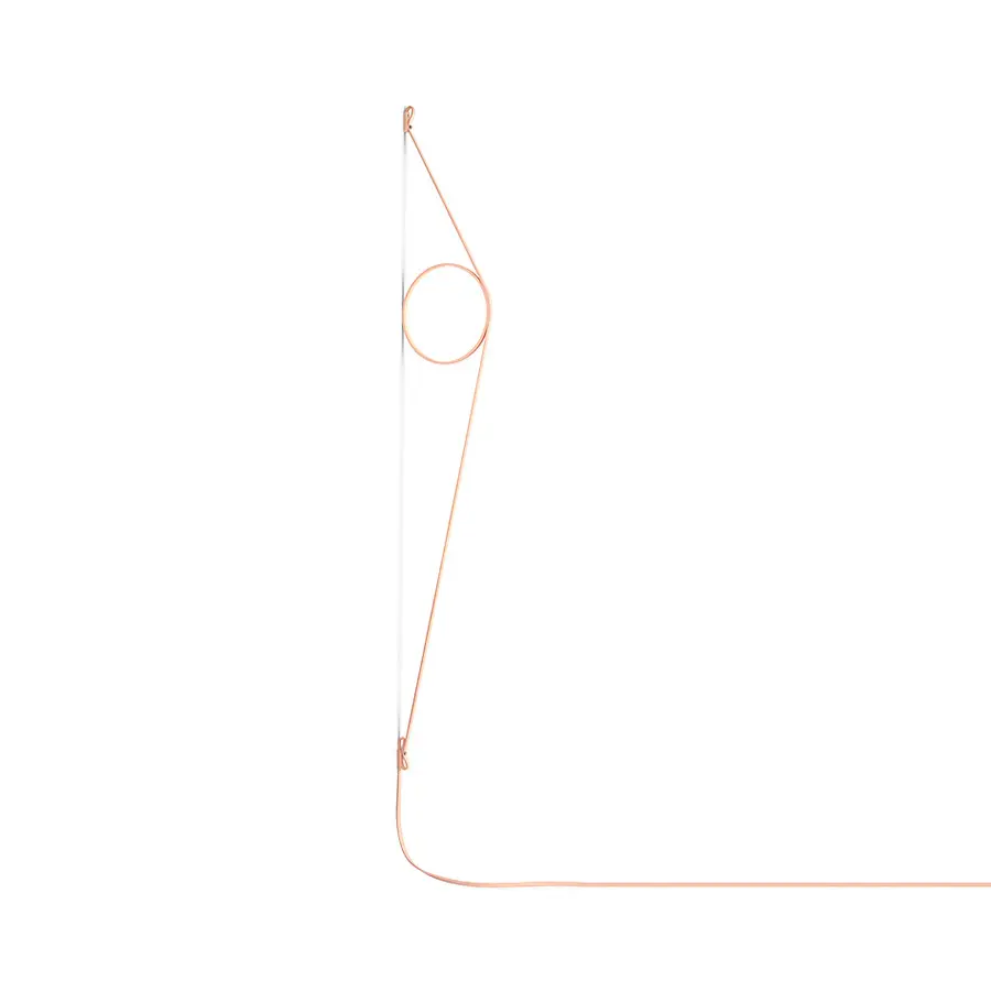 El diseño combina un cable eléctrico hecho a medida con forma de correa con un anillo de aluminio con una tira de LED incorporada, lo que da lugar a una luz de pared liviana y fácil de montar.
