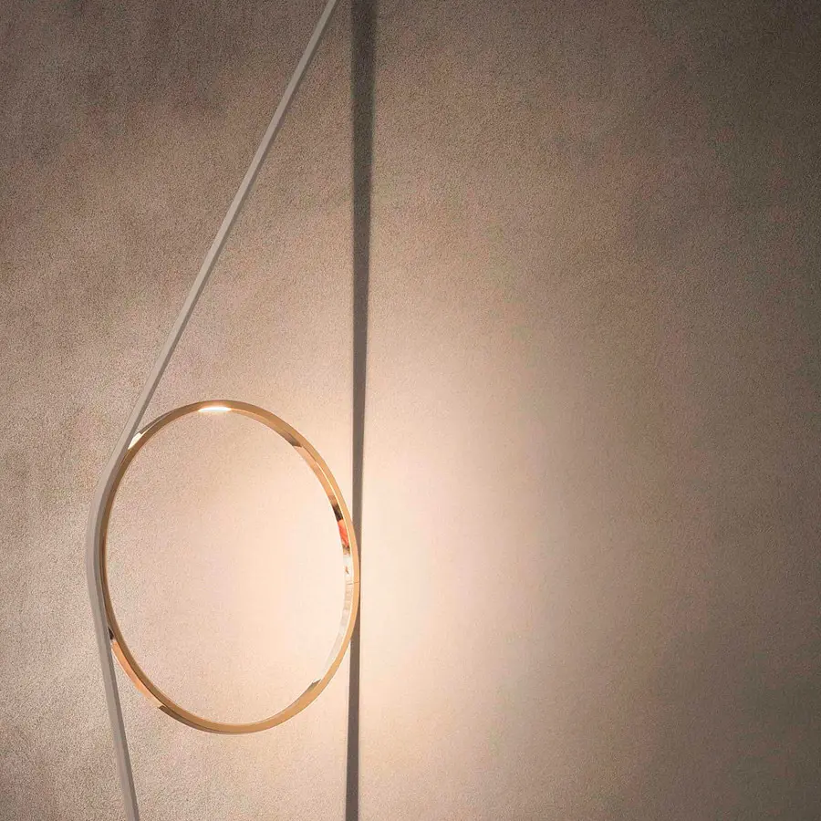 Lámpara de pared de luz indirecta compuesto por un cuerpo de aluminio extruido calandrado con acabado mediante proceso galvánico o pintura. El cable tangente especial, de goma coloreada, garantiza la alimentación eléctrica. El cable se fija en la pared con las juntas de ABS en el mismo acabado del anillo. Función de regulación de la intensidad mediante un interruptor de pedal en el cable. Suministro eléctrico de clavija con enchufes intercambiables. La longitud útil del cable es de 2,5 metros.