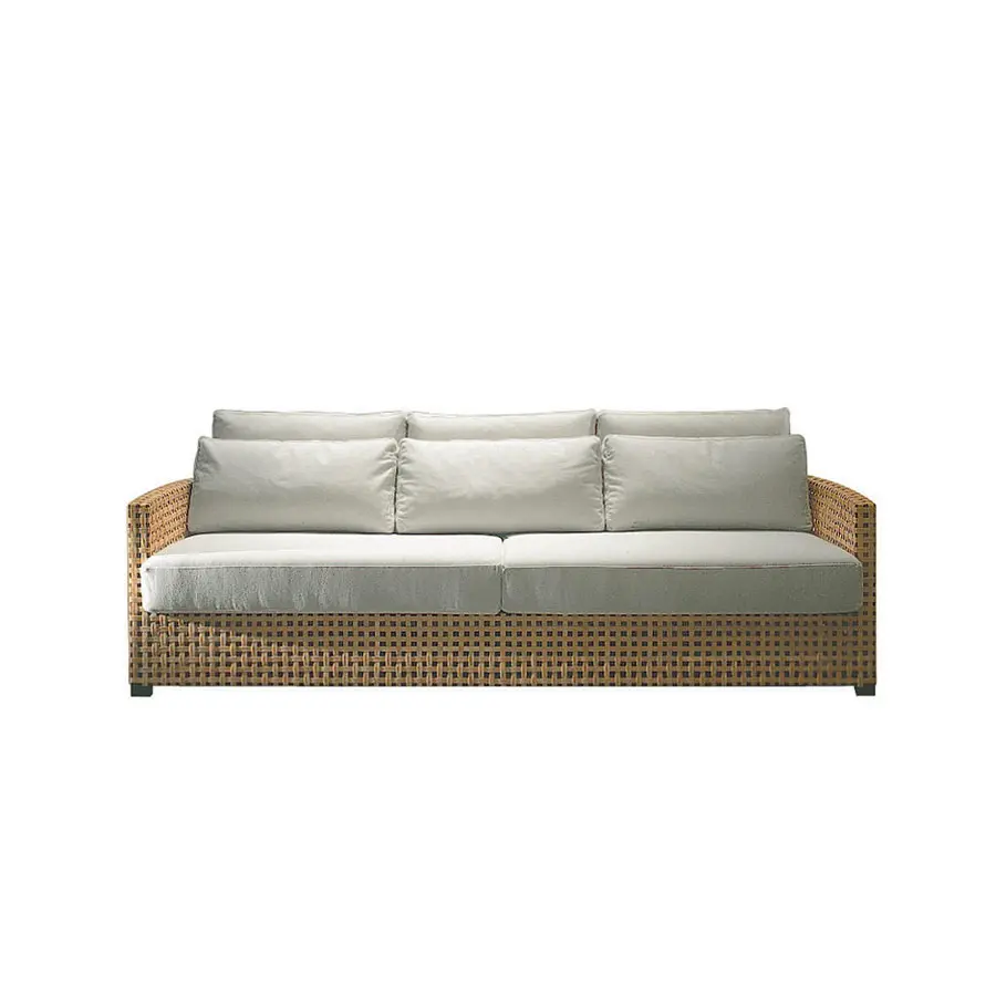 Una estructura de líneas rectas, pero de gran ligereza visual, caracteriza a la familia de sofás WK, disponibles en dos o tres plazas. Una propuesta con un atractivo clásico y exótico al mismo tiempo, con estructura de haya revestida con una textura realizada con entramado de pergamino natural, que contiene suave cojines sueltos de asiento y de respaldo.