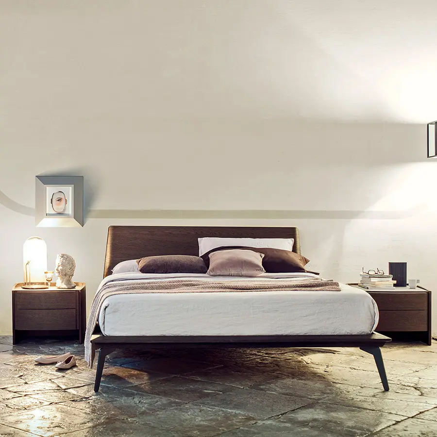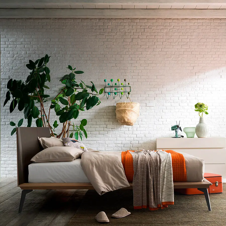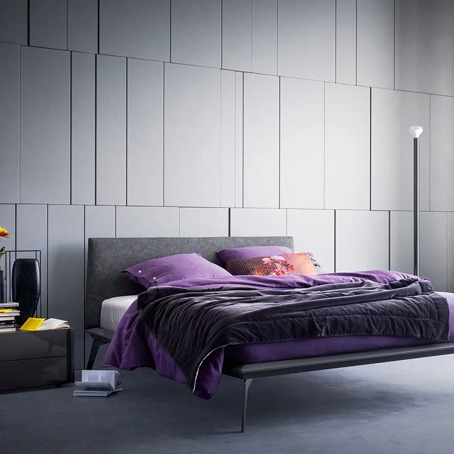 Xilo es una cama con estructura de madera y patas de metal. Se distingue por el perfil redondeado en los lados del cabecero y por las formas, decididas pero ligeras, de la plataforma. Una cama que destaca por sus formas modernas pero que recuerdan lo clásico para adaptarse tanto a espacios contemporáneos como clásicos para disfrutar de momentos de relajación. Estructura de madera con patas de metal, con formas fuertes y ligeras.