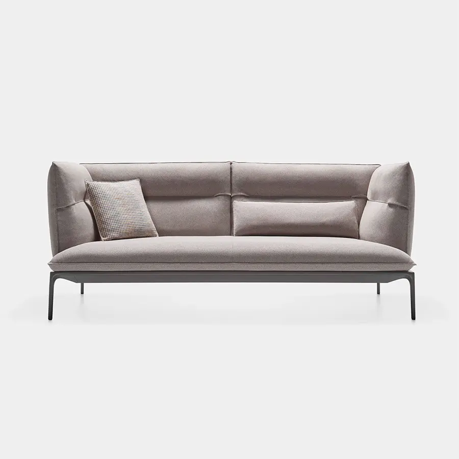 Sillón y sofá con fuerte personalidad y cojines grandes, que proporcionan una comodidad considerable y una gran funcionalidad. Disponible en dos profundidades de asiento diferentes y en dos alturas de respaldo diferentes, lo que garantiza una posición cómoda para sentarse y una fuerte adaptación a las necesidades y requisitos del momento. Marco de aluminio compuesto con bandas elásticas, pies de aluminio fundido a presión. El marco está pintado de blanco mate, gris piedra y gris antracita.