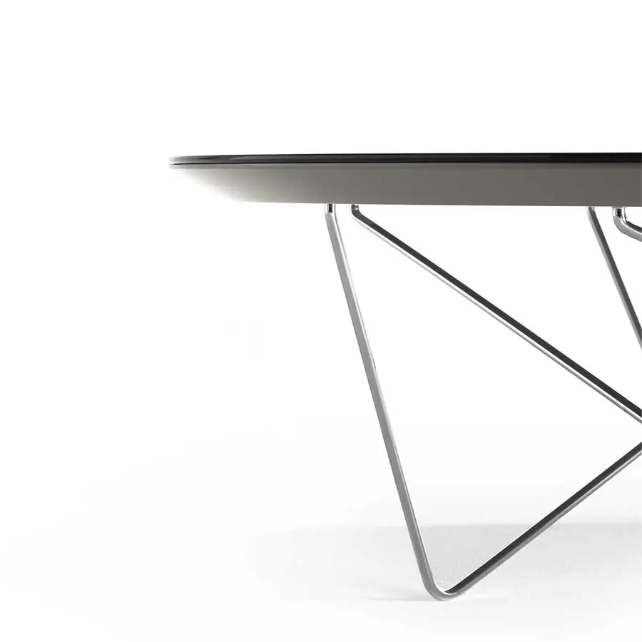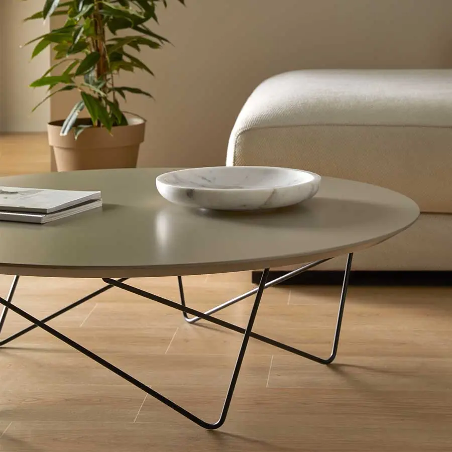 Yohsi es una colección de mesas de centro, compuesta por una tapa circular apoyada sobre un entramado de varillas metálicas curvadas que son la esencia de la pieza. Las mesas pueden personalizarse en laca, nogal, roble, espejo fumé gris, espejo fumé bronce, cristal negro, compacto pizarra o cerámica statuario y las patas metálicas pueden ir en laca negro termolacado, en laca de otros colores, en cromo o en latón.