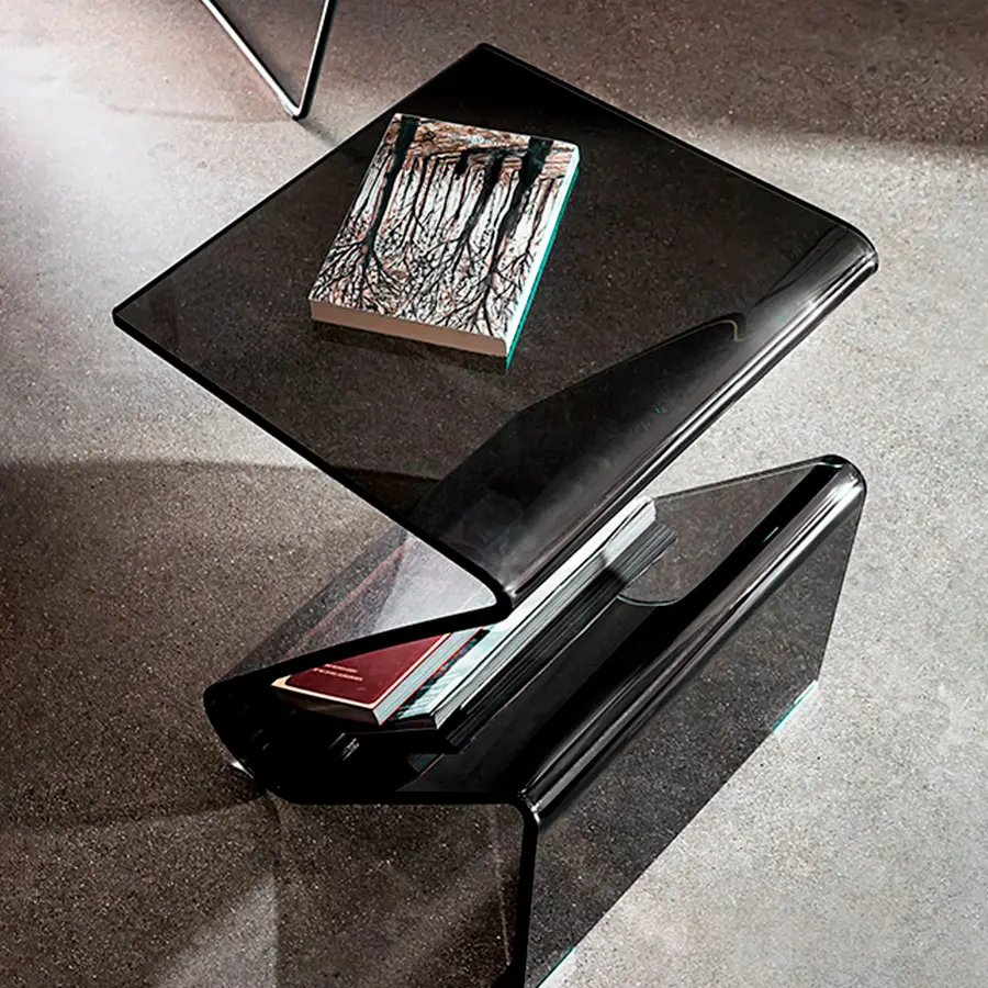 3 pies es una colección de mesas de centro hexagonales hechas de vidrio doblado, capaz
