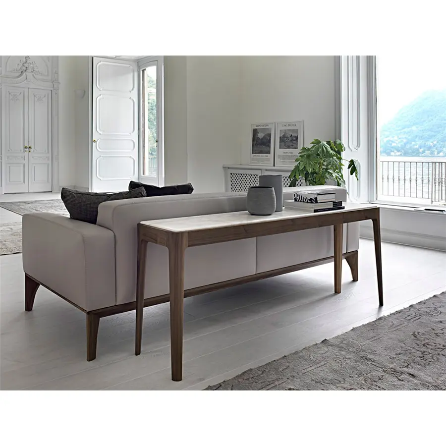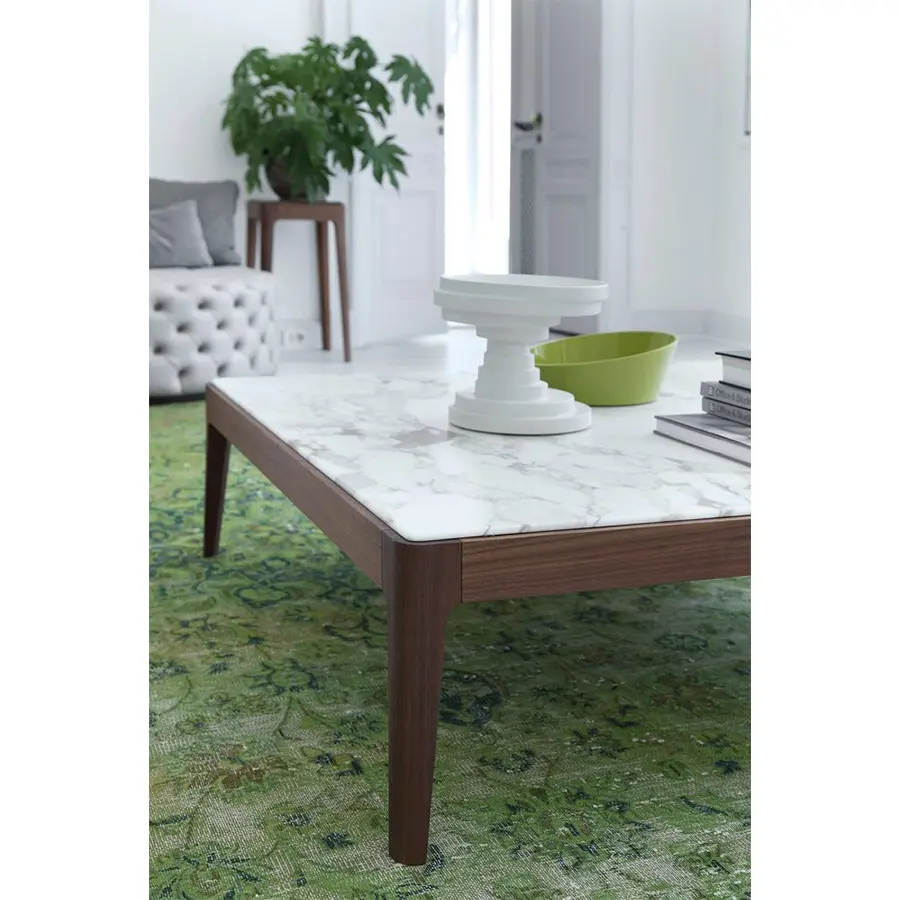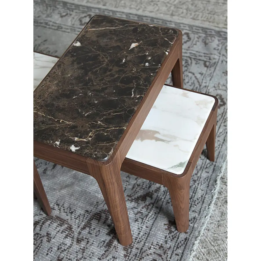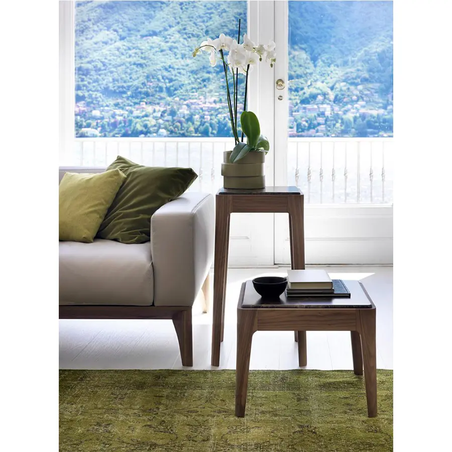 Serie de mesas de centro o auxiliares o de consolas de varias dimensiones. Estructura de nogal canaletta macizo y tapa de madera, de mármol o de cristal retrobarnizado. Ziggy nace desde la simplicidad y perfección, manteniendo el carácter artesanal que tanto caracteriza a Porada. Disponible en una amplísima variedad de medidas y acabados, se adapta a todos los ambientes.